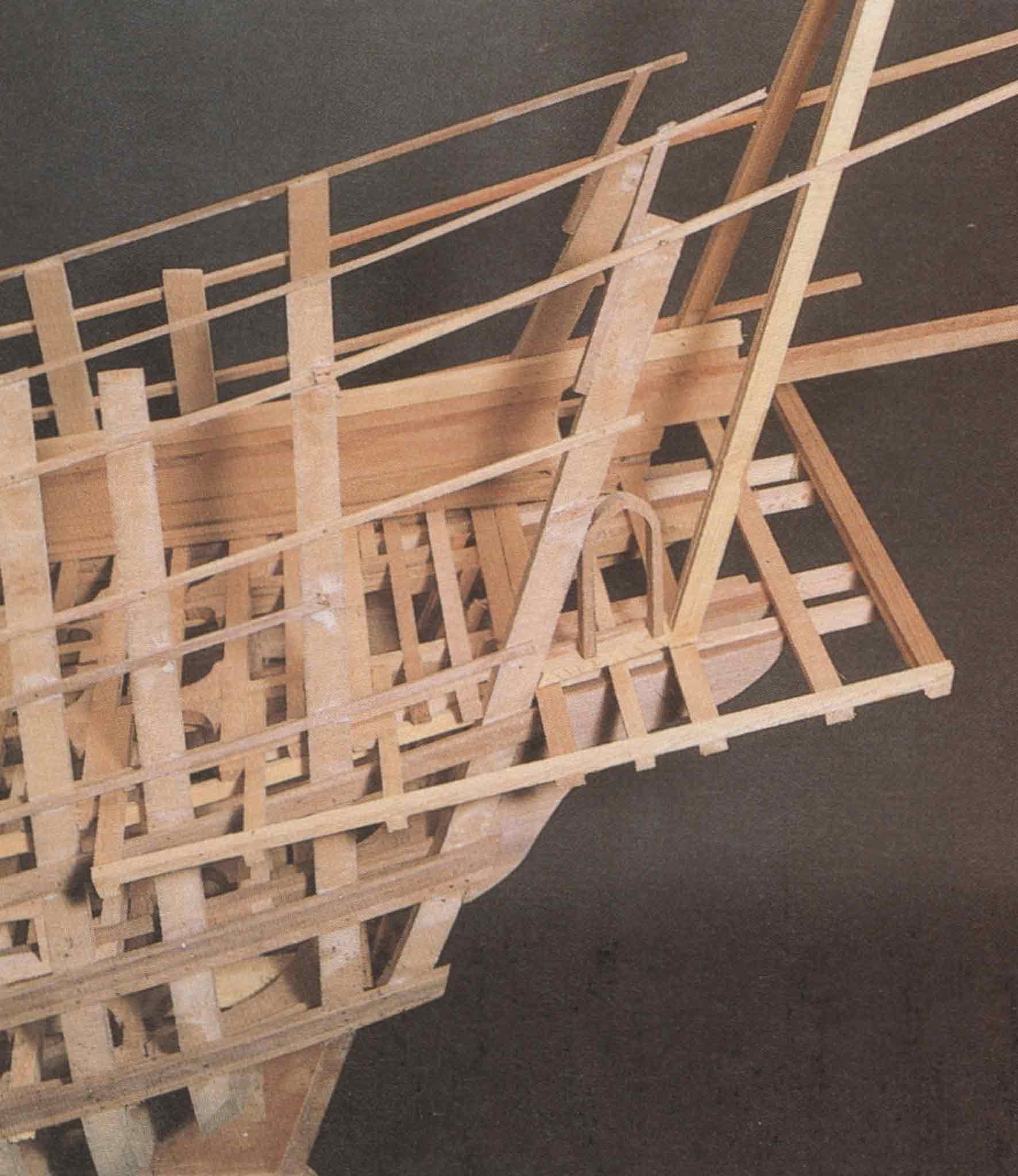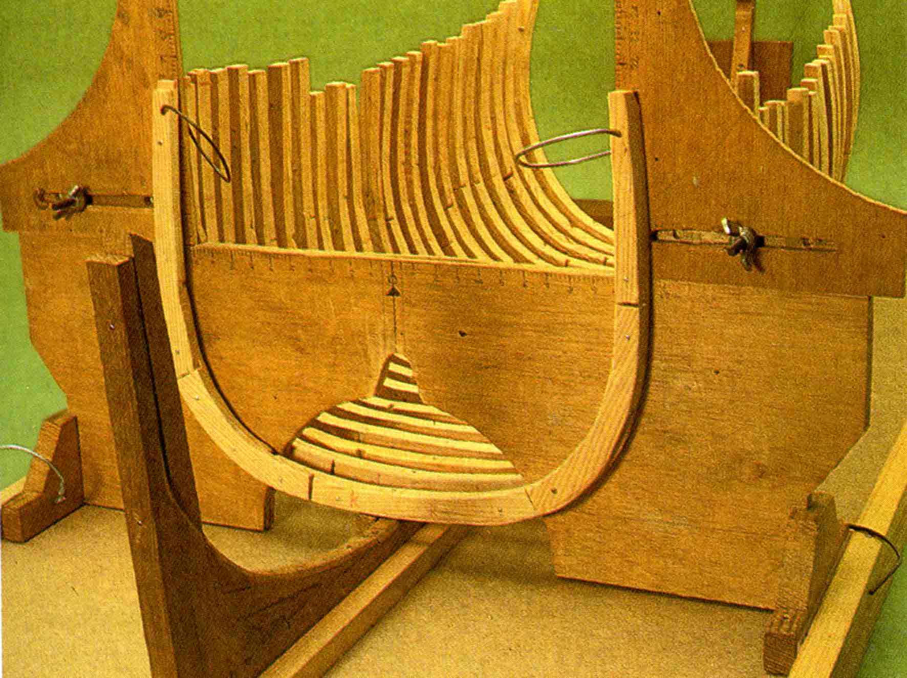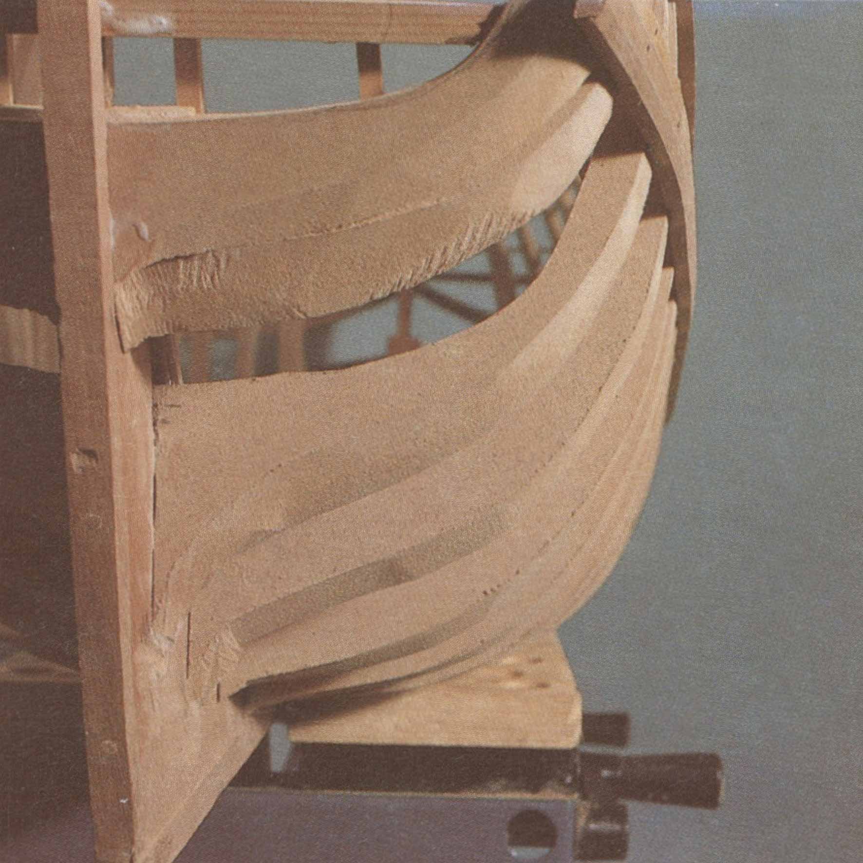 Comprobaremos constantemente, mediante la colocación de algunas tracas, que no se producen abultamientos ni depresiones en la forma general. Cuando todo el conjunto esté perfectamente modelado, procederemos a la confección de las cuadernas.