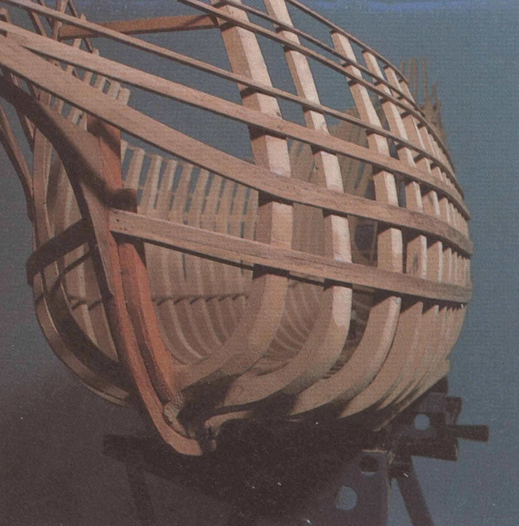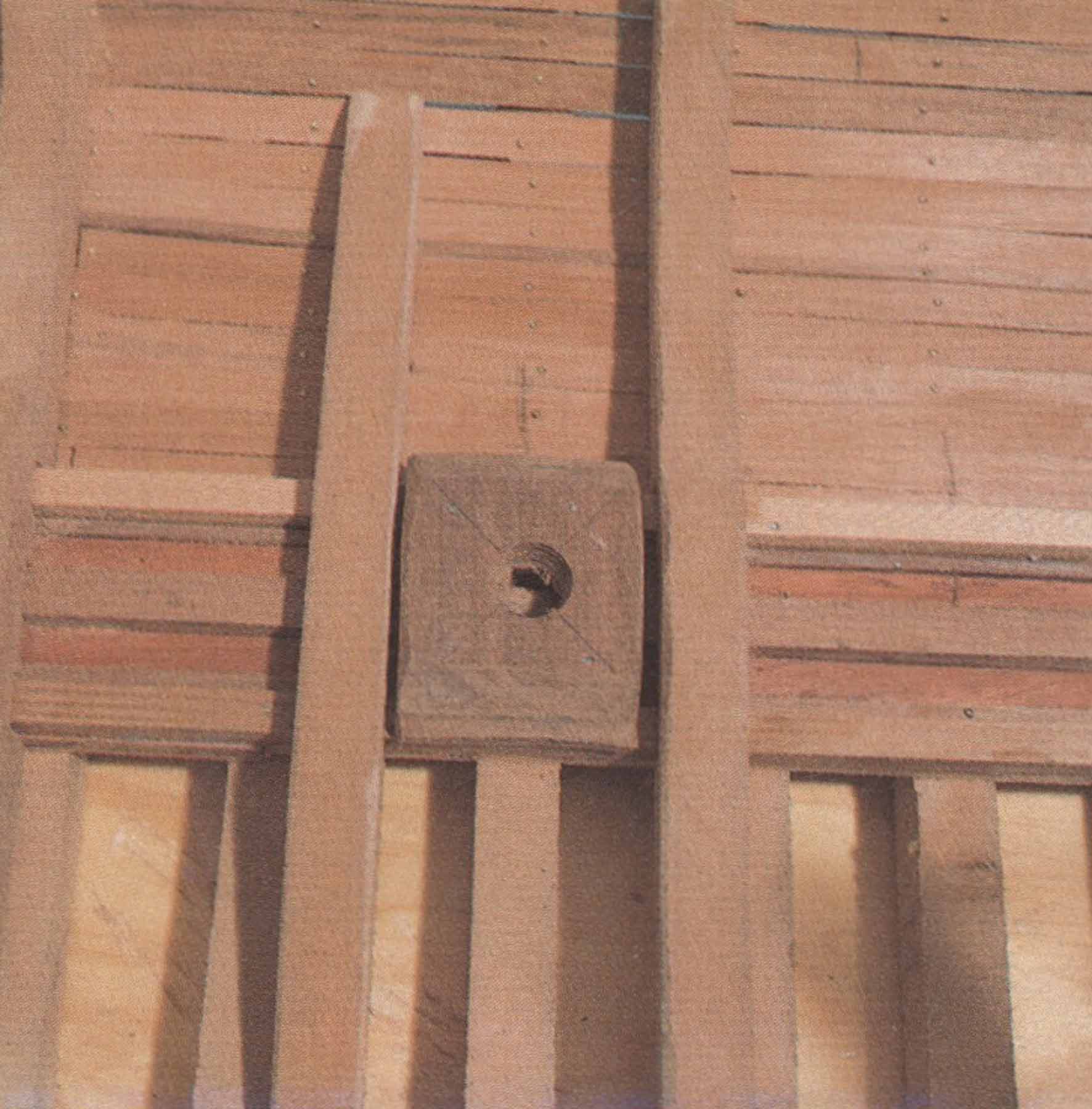 La colocación de las cuadernas en los buques antiguos de madera suponía la construcción de unos andamiajes especiales y complejos que, como es natural, nosotros no utilizaremos. Sin embargo, sí es muy importante dotar a nuestra nave de un soporte o cuna adecuado, para poder trabajar con facilidad, accediendo a cada uno de los componentes sin grandes problemas. Se han descrito muchas clases de soportes usados por modelistas navales de todo el mundo: plantillas internas y externas donde se encajan las cuadernas, cunas especiales con ranuras para colocarlas. En general, todos son sistemas válidos, pero muy complicados. Nuestra experiencia nos ha inclinado por un sistema que consideramos sen- cilio y al alcance de todos. Se trata de un simple banco de trabajo cuyo tablero esté dividido en dos partes separa- bies o, si no disponemos de ella, mediante una tabla sobre la que se fijarán dos largueros que dejen en medio una ranura de la misma anchura de la quilla. En cualquier caso lo importante es poder encajarla fuertemente sobre una guía, de modo que quede fija y derecha, al tiempo que o bien podemos rodear el conjunto para trabajar con facilidad, o sea, fácil de mover y poner en cualquier posición. Debemos dejar sobresaliendo la parte de quilla donde se encajarán las cuadernas, que es el borde superior del alefriz. Así, al colocarlas, se asentarán sobre la superficie del soporte, alineándose todas a la misma altura, salvo, como es lógico, las de proa y papa, que siguen su propia línea previamente marcada en la quilla.