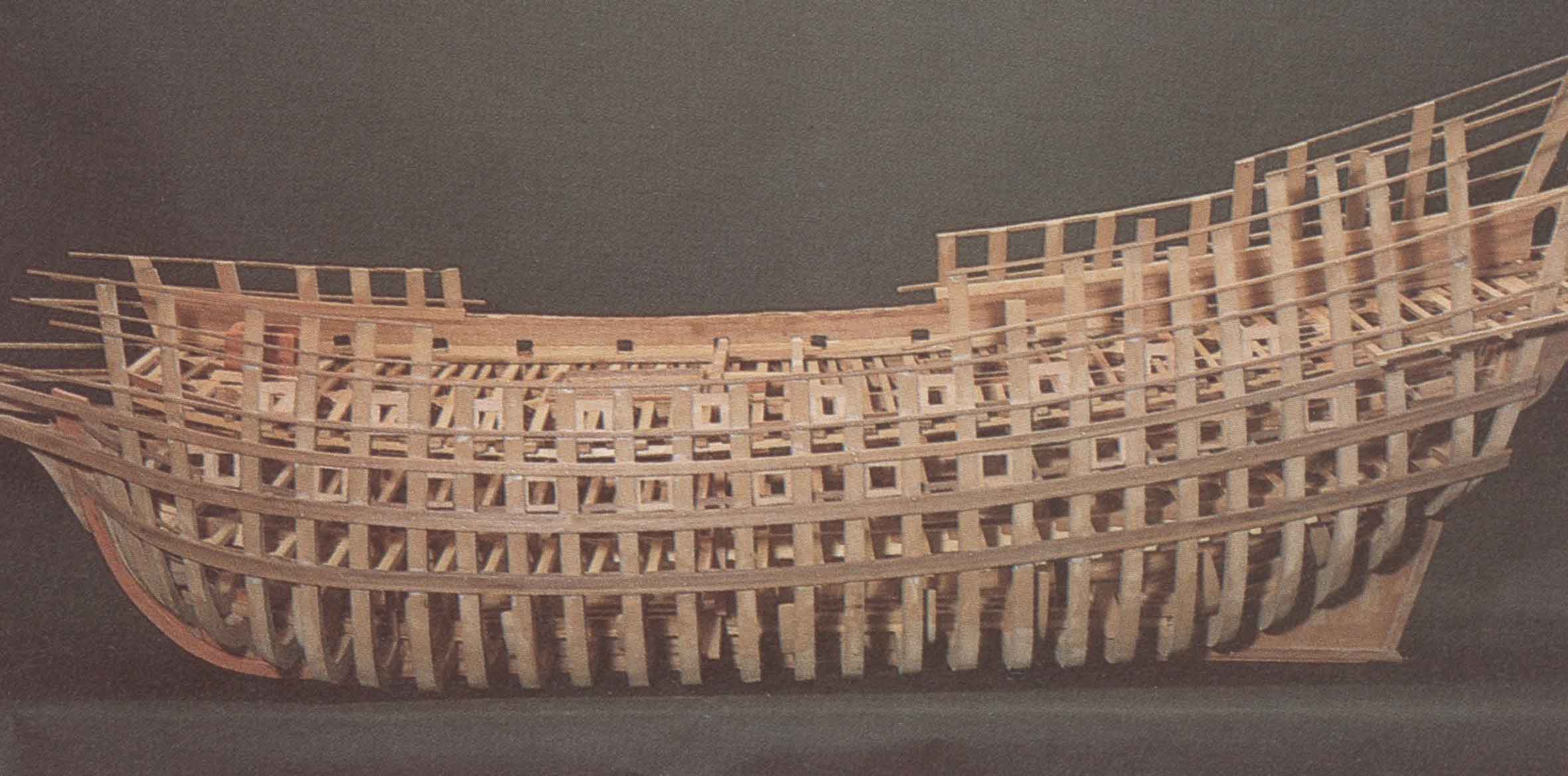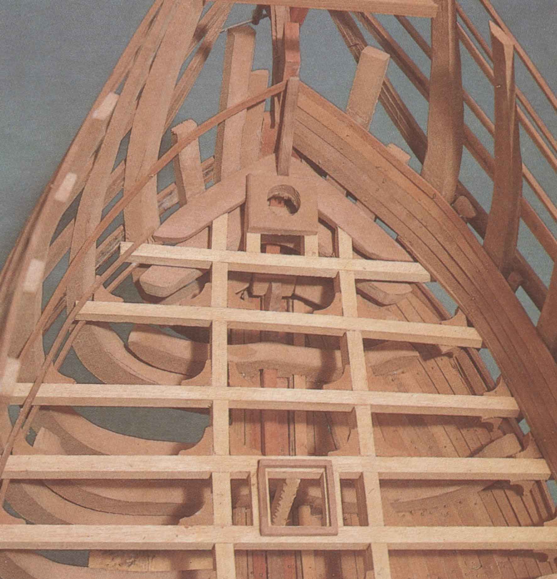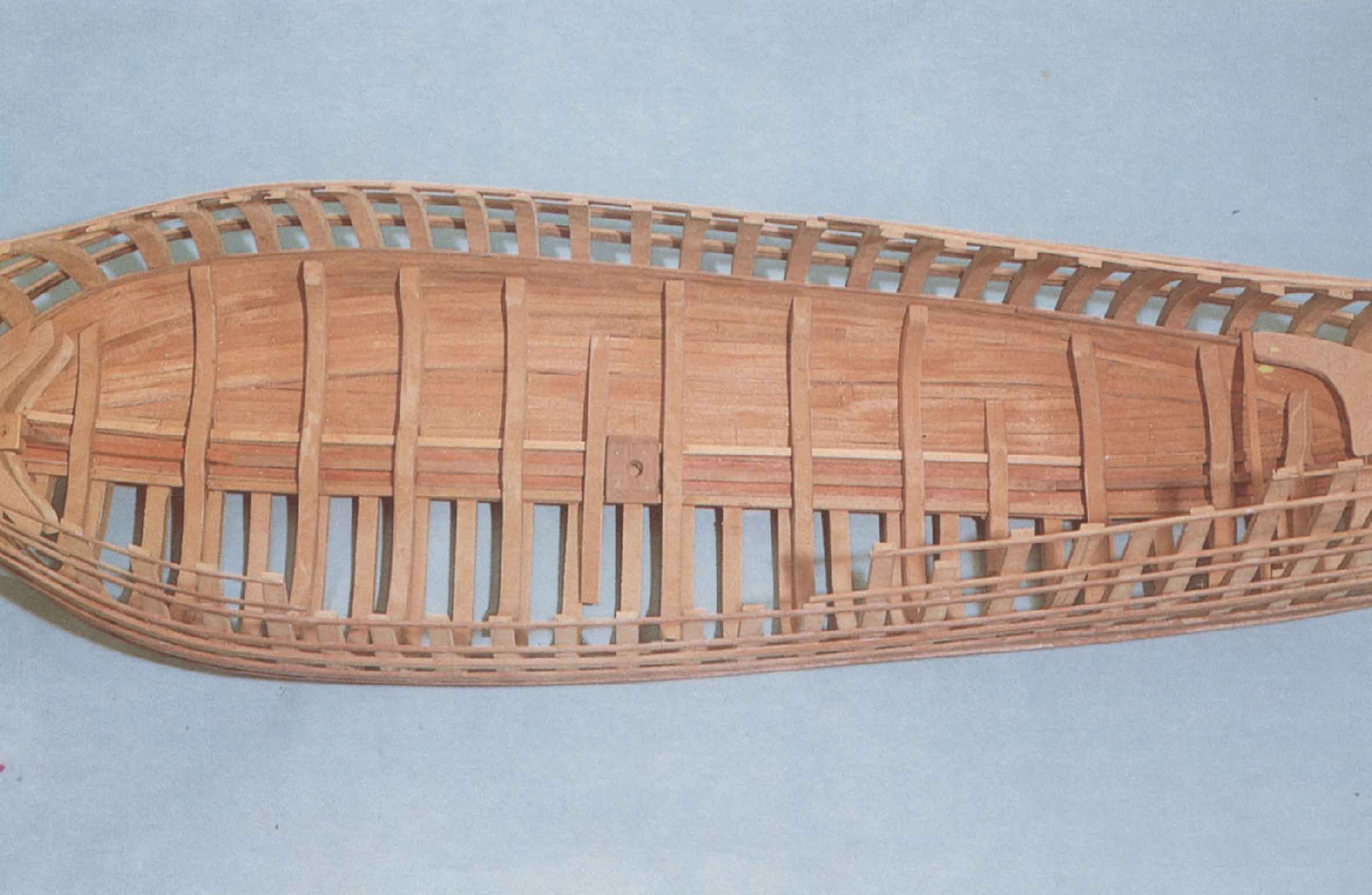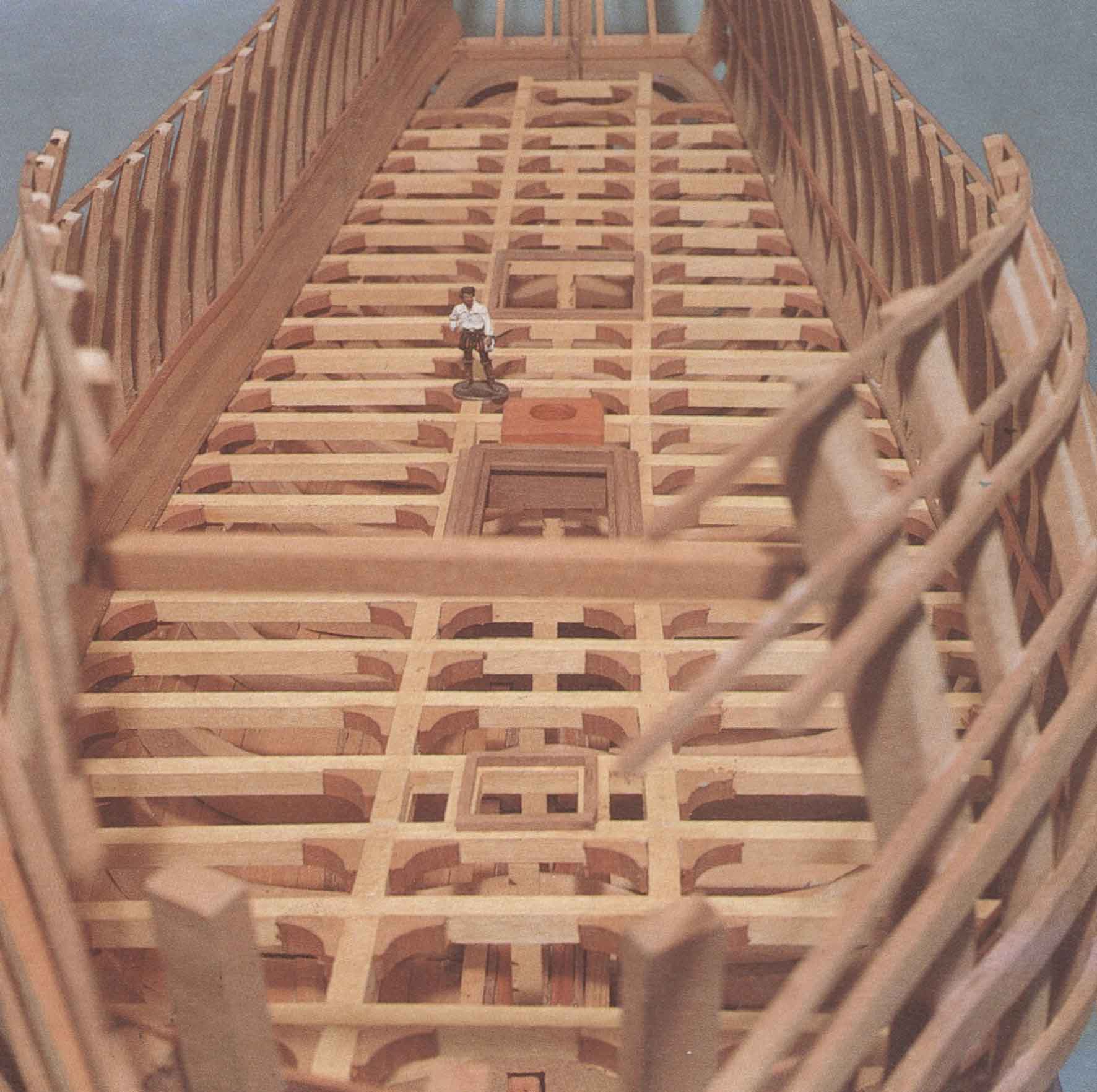 Comenzaremos forrando la bodega hasta la primera cubierta. Sólo forraremos uno de los costados para poder tener acceso visual desde el lado descubierto. Iremos alternando, según los planos, a nuestro propio diseño las tracas simples con los «palmejares», que son a modo de cintones internos y, por lo tanto, más gruesos que los tablones de forro. Debemos lograr que las tracas del forro cercanas a la primera cubierta coincidan con la línea formada por ésta. Así, sobre la última traca clavaremos el durmiente, que es un grueso madero sobre el que se asentarán los baos o vigas que sujetan la cubierta. Como ocurre con el forro exterior, las tracas han de ser talladas a proa y popa para que se adapten a la forma del casco siguiendo la línea marcada por el durmiente, de modo que cada tablón continúe ininterrumpidamente de proa a popa. Todas las tracas serán pegadas y clavadas.Forrada la bodega se colocarán los ángulos, curvatones , buzardas y bularcamas que refuerzan la estructura interna. Estas piezas son en realidad varengas adaptadas a las formas internas del casco, clavadas sobre las verdaderas varengas de las cuadernas, sobre el forro y la quilla. Pueden ser transversales o colocadas en diagonal, según modelos y épocas. Es aconsejable que estas piezas no sean cortadas con bordes precisos y nítidos, sino que se produzcan, tanto en el corte como en el lijado, algunas imperfecciones para imitar el trabajo de azuela de los carpinteros. También se colocarán las carlingas de los mástiles del mayor y trinquete, dejando una abertura en su centro para que encastren sus extremos inferiores.