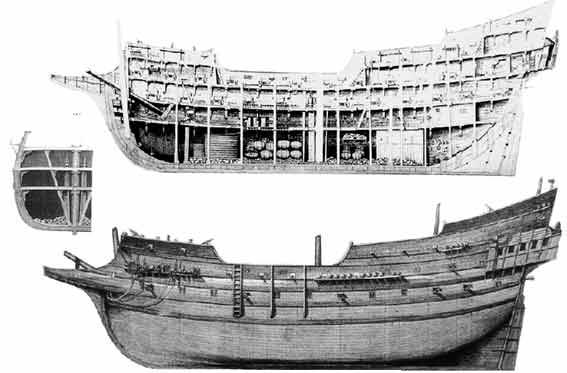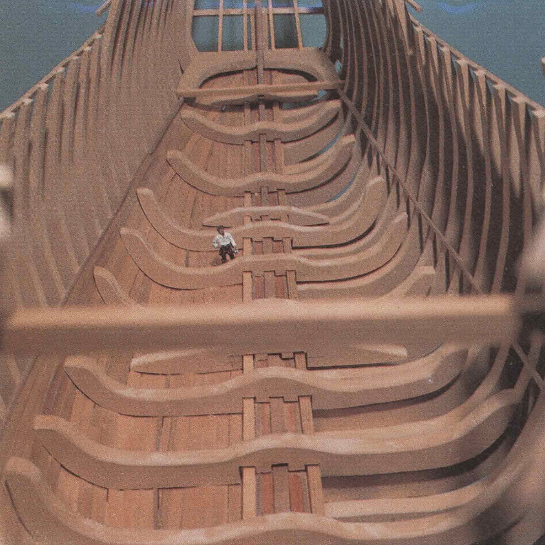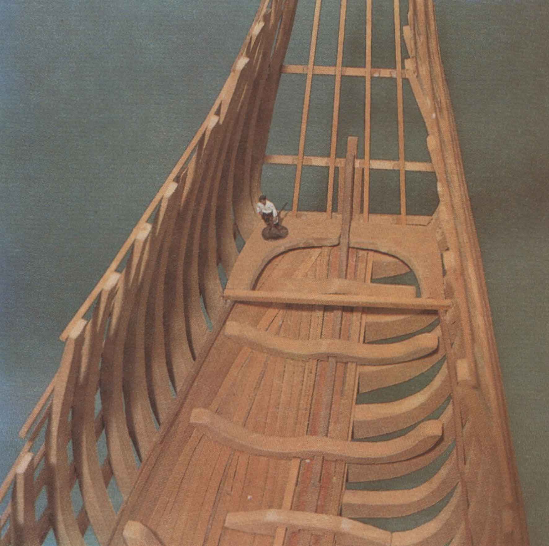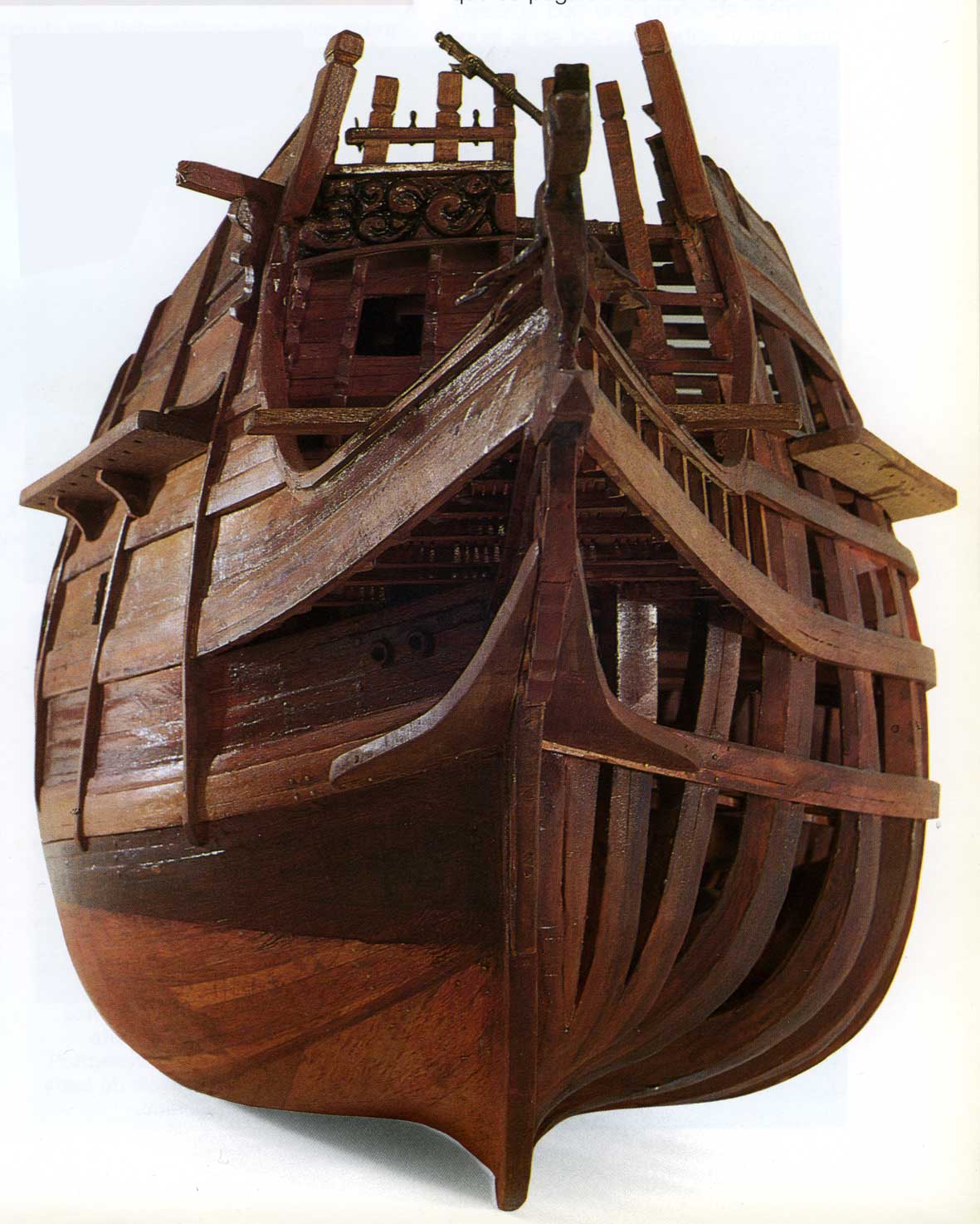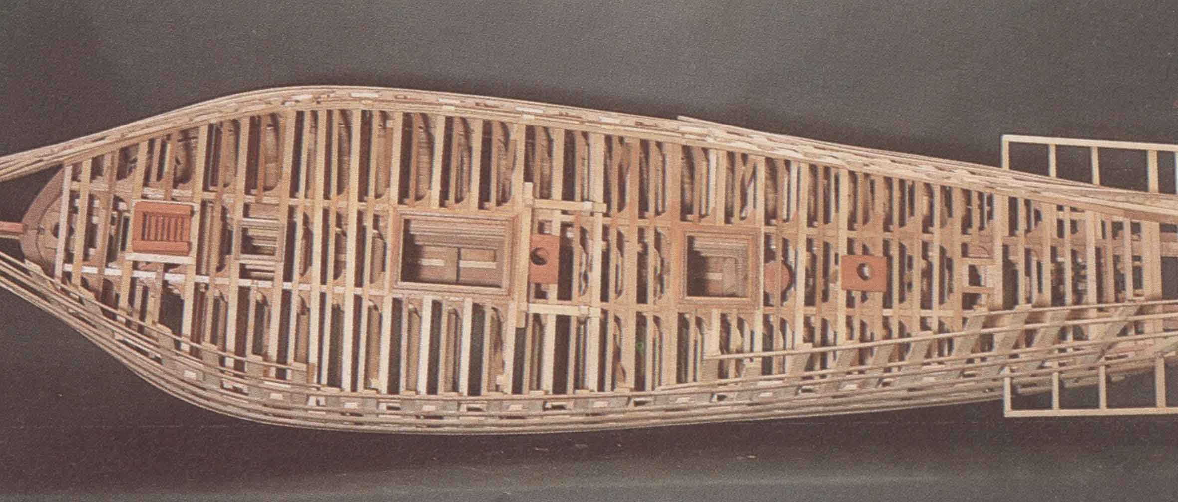Comenzaremos forrando la bodega hasta la primera cubierta. Sólo forraremos uno de los costados para poder tener acceso visual desde el lado descubierto. Iremos alternando, según los planos, a nuestro propio diseño las tracas simples con los «palmejares», que son a modo de cintones internos y, por lo tanto, más gruesos que los tablones de forro. Debemos lograr que las tracas del forro cercanas a la primera cubierta coincidan con la línea formada por ésta. Así, sobre la última traca clavaremos el durmiente, que es un grueso madero sobre el que se asentarán los baos o vigas que sujetan la cubierta. Como ocurre con el forro exterior, las tracas han de ser talladas a proa y popa para que se adapten a la forma del casco siguiendo la línea marcada por el durmiente, de modo que cada tablón continúe ininterrumpidamente de proa a popa. Todas las tracas serán pegadas y clavadas.Forrada la bodega se colocarán los ángulos, curvatones , buzardas y bularcamas que refuerzan la estructura interna. Estas piezas son en realidad varengas adaptadas a las formas internas del casco, clavadas sobre las verdaderas varengas de las cuadernas, sobre el forro y la quilla. Pueden ser transversales o colocadas en diagonal, según modelos y épocas. Es aconsejable que estas piezas no sean cortadas con bordes precisos y nítidos, sino que se produzcan, tanto en el corte como en el lijado, algunas imperfecciones para imitar el trabajo de azuela de los carpinteros. También se colocarán las carlingas de los mástiles del mayor y trinquete, dejando una abertura en su centro para que encastren sus extremos inferiores.