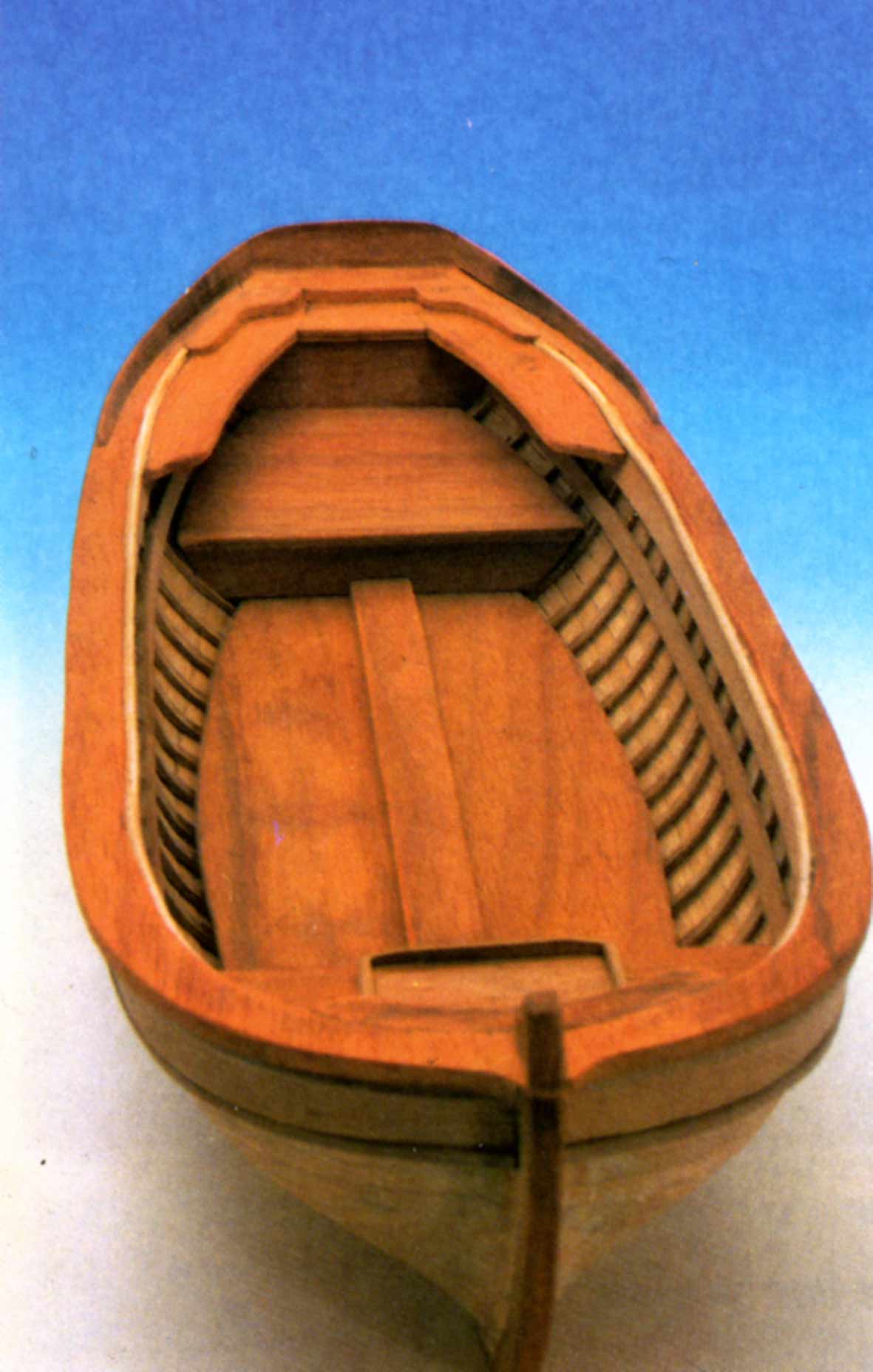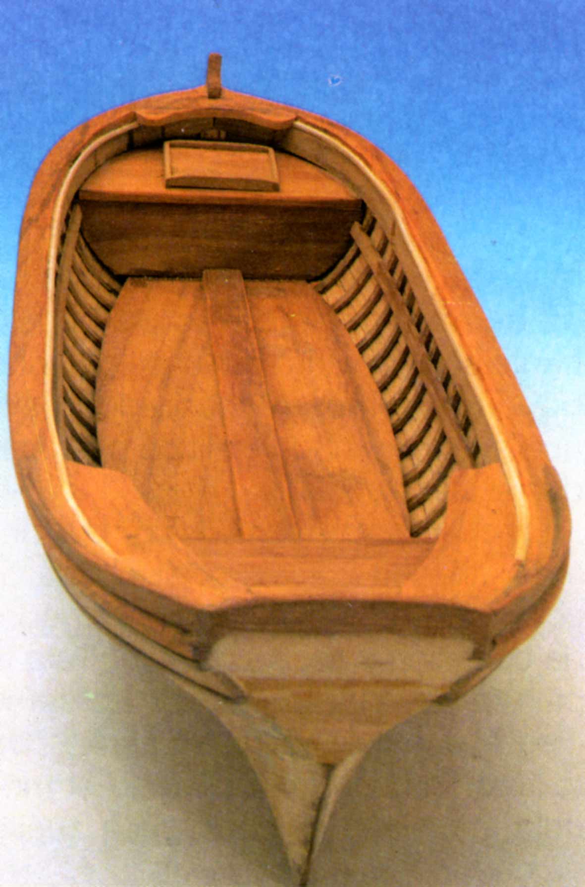 De este modo queda conformada la estructura de la chulapa, que deberá ser alisada mediante lija, sobre todo en las formas de proa y popa, para que las tracas del forro asienten con facilidad. El forro se realizará como cualquiera otra maqueta. Utilizaremos clavitos de sujeción, dejando fuera su mitad superior para poderlos extraer posteriormente. Las tracas se pegarán a las cuadernas teniendo la precaución de que no se peguen al molde.