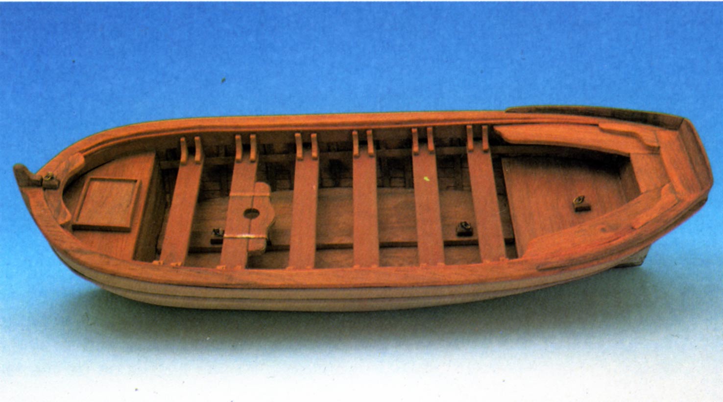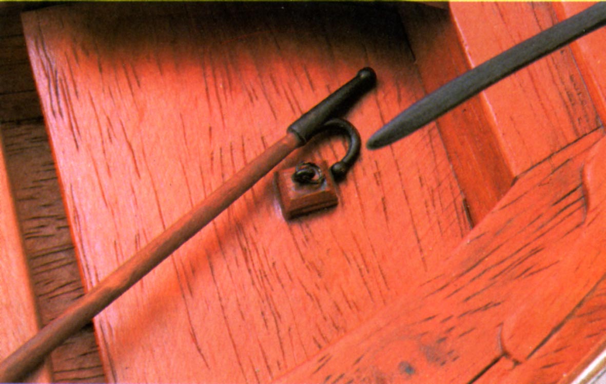 Para dar una sensación de uso y desgaste, hemos empleado una pátina de betún judáico en la parte externa del casco, aplicada con brocha suave y retirándola con un paño limpio antes de secar. El mismo procedimiento es válido para los accesorios. Todos los elementos metálicos como argollas, abrazaderas o bisagras se pintarán con negro satinado. El interior de la barca puede dejarse con su tono natural de madera o pintarlo de rojo anaranjado, que es como se usaba normalmente. En este caso se ha utilizado para la mayor parte de las piezas internas una madera de color rojizo, tipo coral, igualando el resto con pintura. Un barniz satinado transparente es la terminación ideal de nuestro modelo.