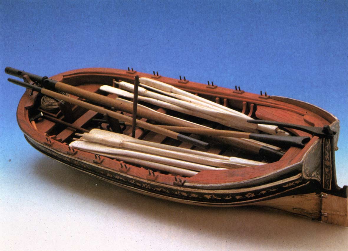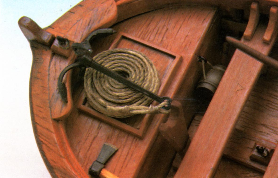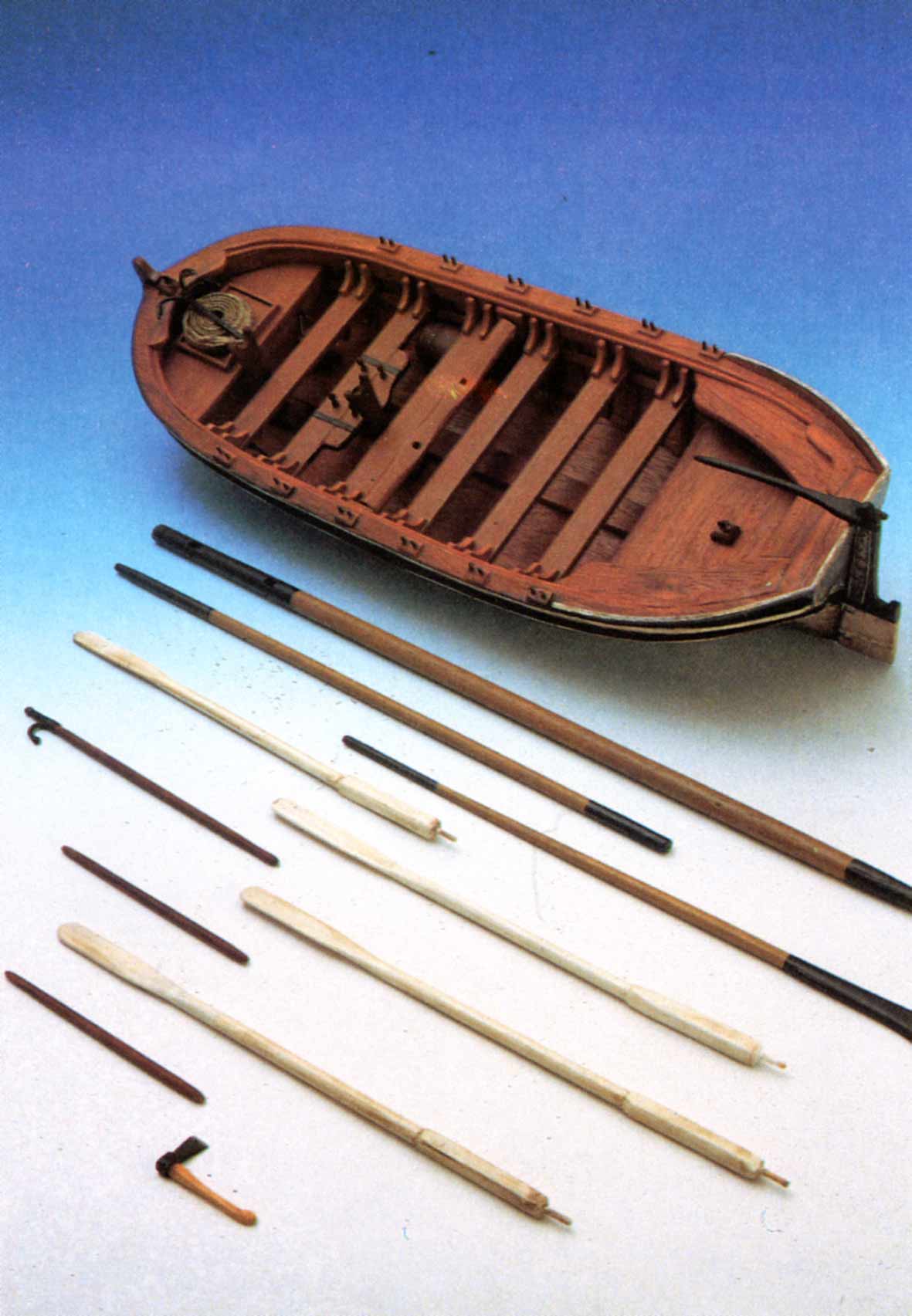 Cuanto más completo sea el equipo de la chalupa, más sensación de realidad obtendremos de nuestro modelo. Por tanto, no ahorraremos trabajo en esta fase de construcción, confeccionando los remos, mástiles, vergas, barriletes, incluso el rejón con su aparejo y herramientas tales como hachas y bicheros.
