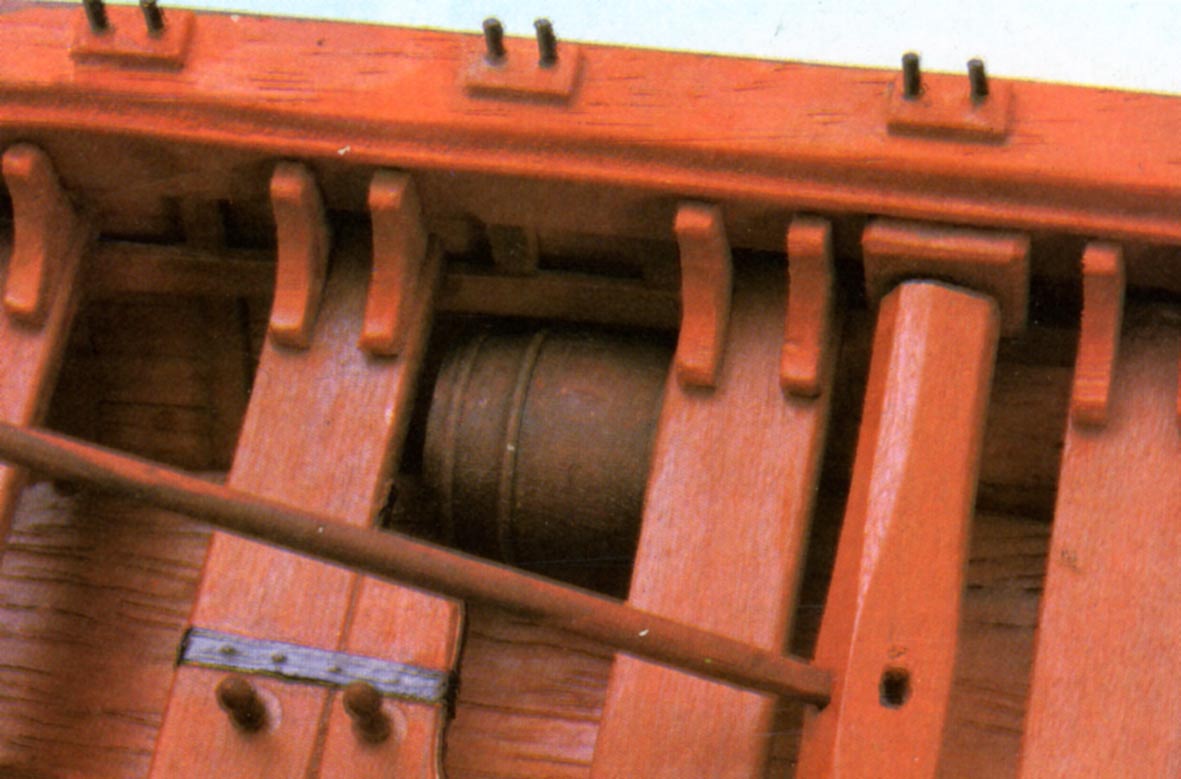El cabestrante para la maniobra de anclas de la chalupa es un madero de sección cuadrada que cruza la lancha en su mitad de borda a borda. Los extremos y el centro van rebajados en sus bordes dejando la zona de los orificios para las barras o palancas en su grueso original. Los dos extremos están coronados por sendas espigas de metal que juegan en unos ojales horadados sobre dos tacos de madera, uno a cada banda justo bajo la tapa de regala. Las barras del cabestrante son de varilla cilíndrica con uno de los extremos recuadrados para que encajen en los orificios practicados al efecto.