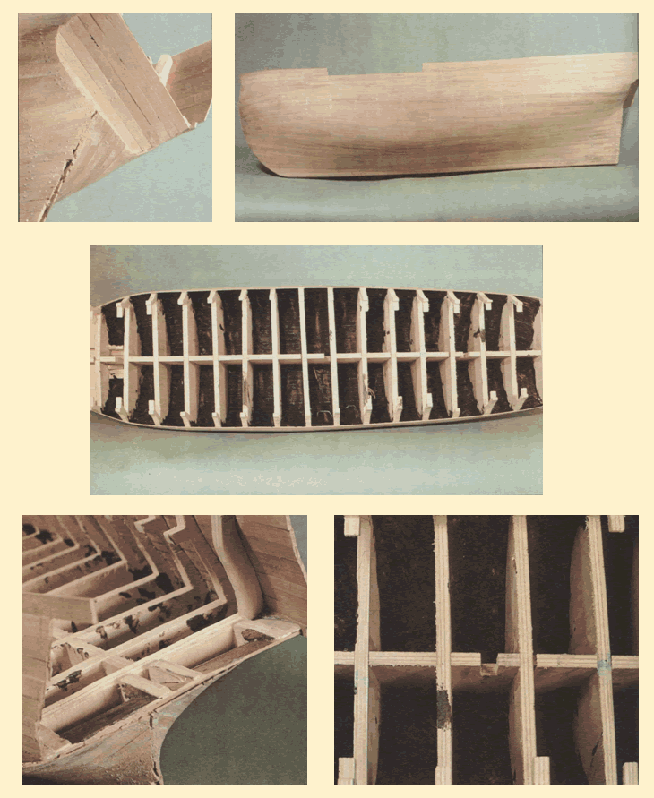Ésta es una de las cuadernas de proa con su forma peculiar propia de los buques de la época. En ella se pueden apreciar sus partes componentes. En realidad cada cuaderna eran dos, unidas entre sí por cabillas de madera o pernos de hierro. La pieza inferior o varenga se encastra en la quilla; el resto son ligazones contrapeadas.