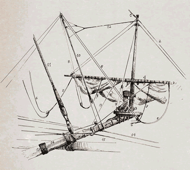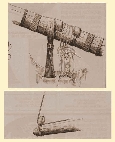 Aquí se aprecia claramente la troza que mediante un gancho se une a un cabo que atraviesa el palo, casi en su tope.