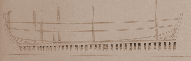 La quilla, formada por varias piezas, era lo primero que se colocaba sobre las gradas del astillero. formaba lacolumna vertebral del barco, sobre la que se colocaban posteriormente las costillas. En este caso, la roda, el codaste y las cuadernas constituyen la estructura que soportará todo el conjunto de la nave.