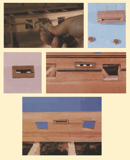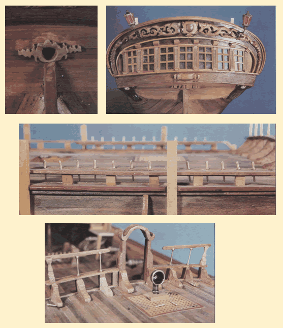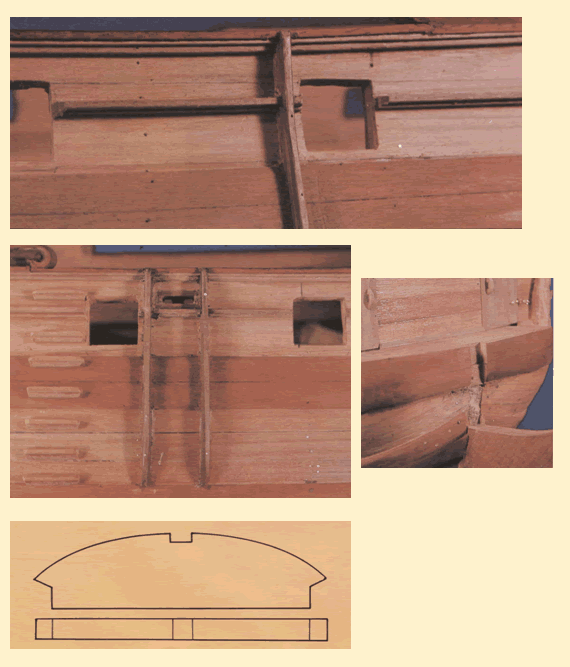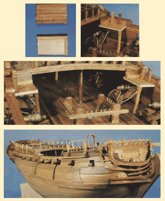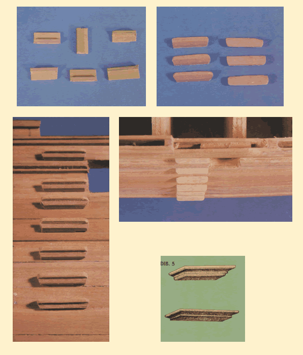 Del resultante se cortarán pedazos a medida que formarán los escalones.Lijados y redondeados (como se indica en el dib. 5) se podrán tallar según el modelo elegido. Se pegarán al casco, bien alineados y equidistantes entre la sexta y séptima tronera, justo donde termina el alcázar y comienza el combés.