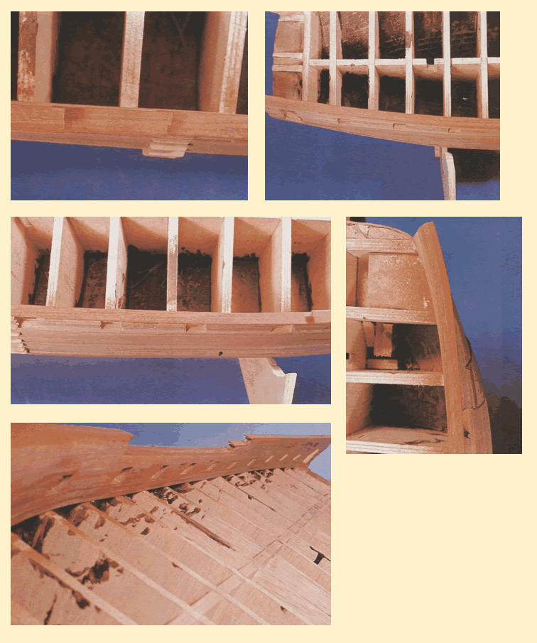 La operación de refuerzo interno puede y debe repetirse tantas veces como se crea necesario, para que la estructura quede lo más sólida posible. La popa, igualmente, será reforzada. Aquí puede apreciarse la colocación de las piezas que la sujetan; dos en cada lado y otras dos en el centro, dejando libre el espacio necesario para, más adelante, realizar el orificio por donde pasará el timón. En esta fotografía puede verse cómo en un primer grado de limado aparece, en algunos sitios, el calafateado. El refuerzo de la amuras se ha hecho sin la pasta utilizada en el resto del casco. Aquí hemos utilizado solamente cola blanca, teniendo mucho cuidado de no impregnar las cuadernas para que no se peguen al forro.