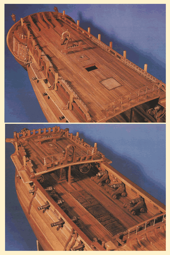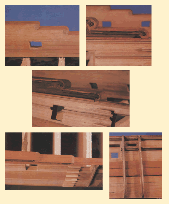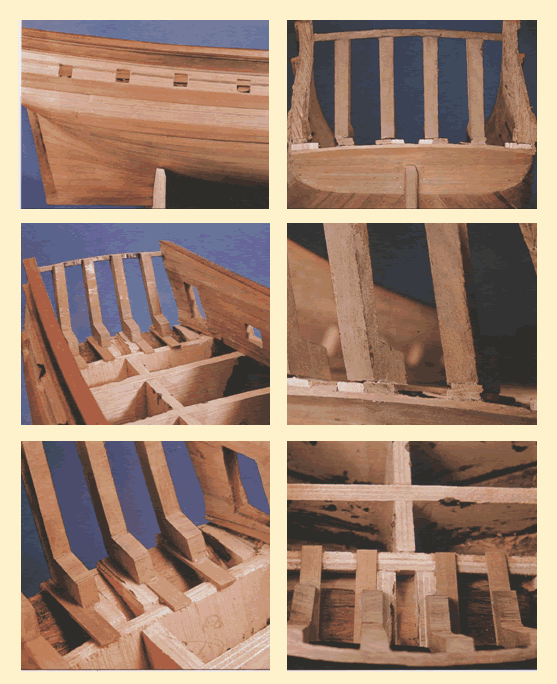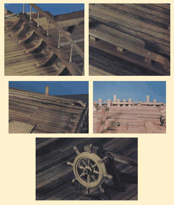 La forma más corriente de sujetar los puentes y toldilla a las amuras era mediante un largo listón adosado a todo lo largo del casco, y a su vez unas ménsulas o piezas en ángulo para soportar el peso de los baos o vigas sobre las que reposa la tablazón del puente. Estas piezas angulares pueden sacarse de alguna moldura con la forma adecuada cortándola en rodajas.