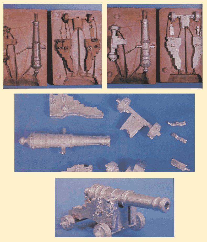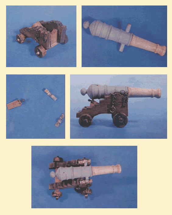 La cureña montada. Observar cómo los accesorios metálicos han sido adaptados para el molde. Las cadenas y argollas son difíciles de obtener en plomo, por lo que el modelista deberá optar por dejarlas puestas o pegar las directamente al metal.