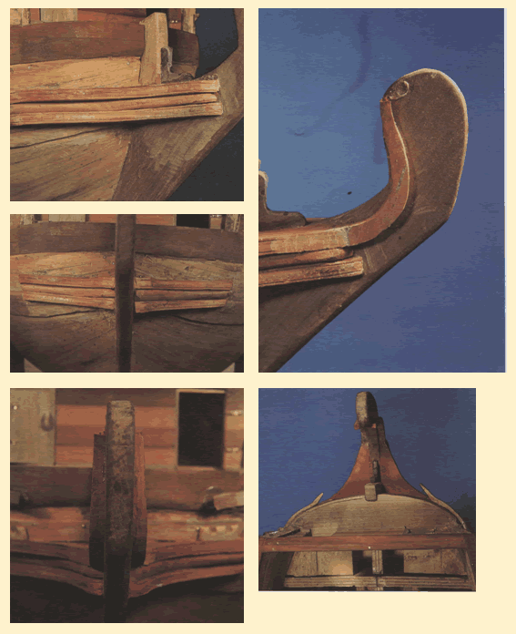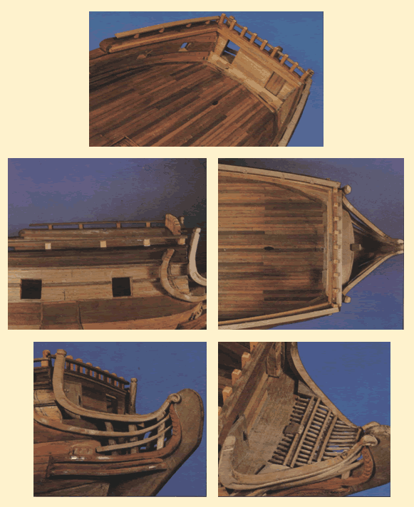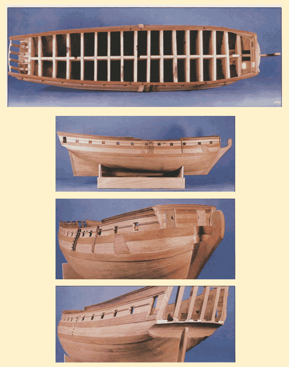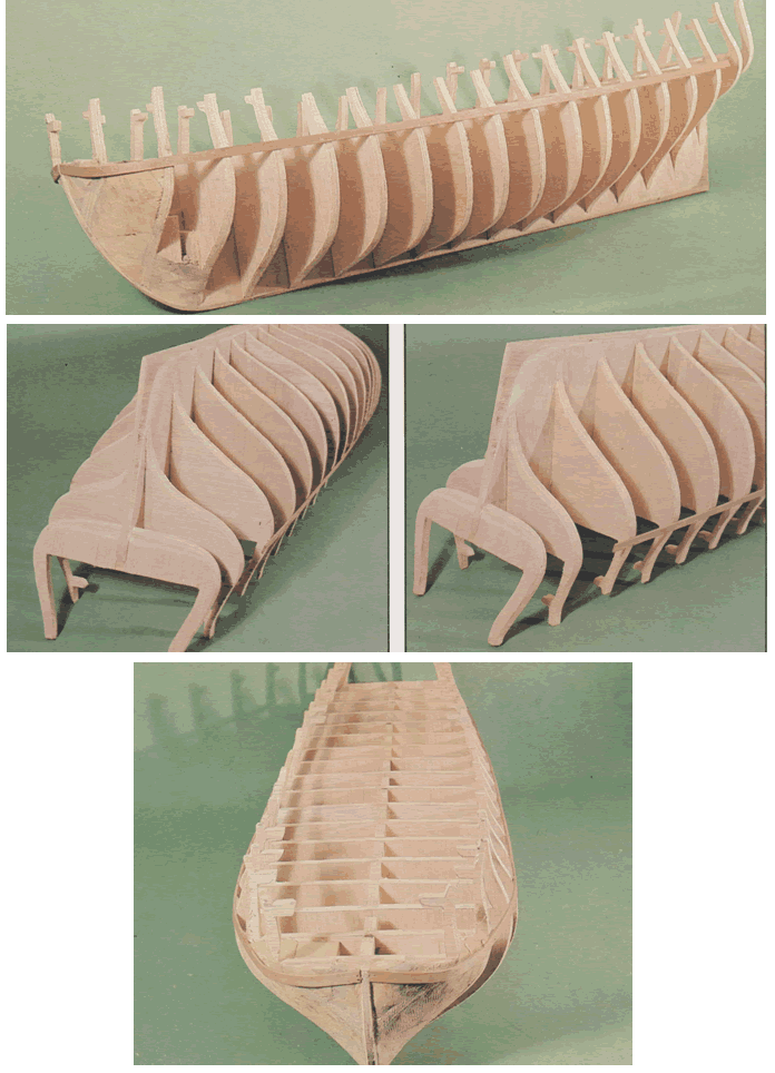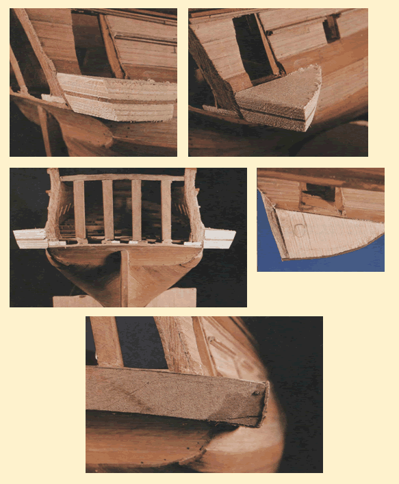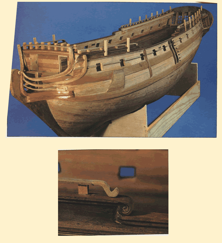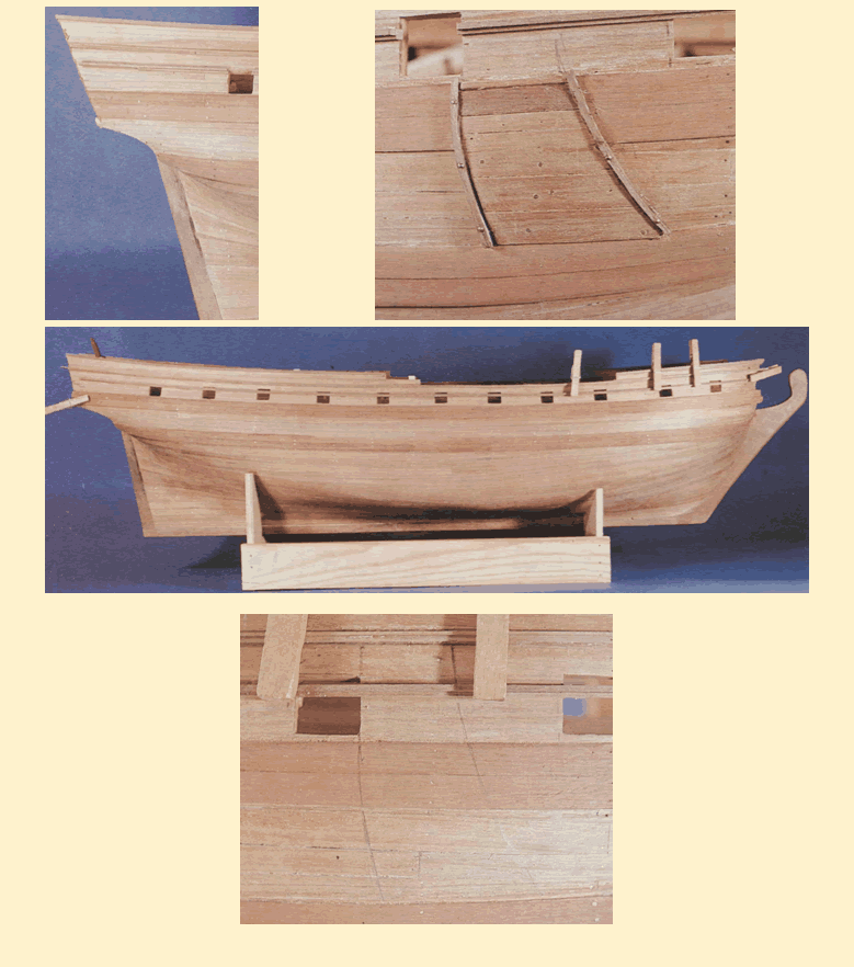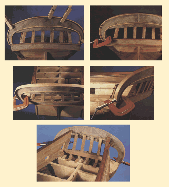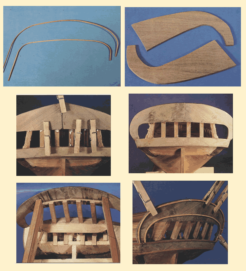Mediante agua y calor se conseguirá la curvatura de popa. Clavar y pegar. Con cuchilla y lima dar la forma del coronamiento en herradura o peineta, típico de estos barcos.