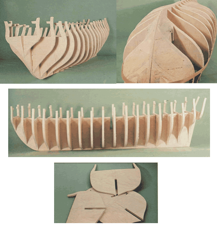 El primer paso para la construcción de la fragata es trasladar las plantillas de mamparos y la falsa quilla sobre un tablero de madera de contrachapado de 7 u 8 mm. Es aconsejable calcular de antemano la cantidad de madera necesaria y dividir el tablero en cuarteles o cuadrados según el número de cuadernas, para que lo corten en el mismo almacén y así no tener necesidad de hacerlo nosotros mismos. Los mamparos serán calcados del plano en papel vegetal. Puede calcarse la cuaderna entera o la mitad de ella por su eje central, interponiendo entre la madera y el papel vegetal un papel de calco. Se sujetarán con papel adhesivo a la madera para evitar movimientos y se pasará cuidadosamente la punta de un lápiz por todo el contorno del mamparo. Se señalará con un número o letra cada una de las piezas antes de comenzar a cortar.