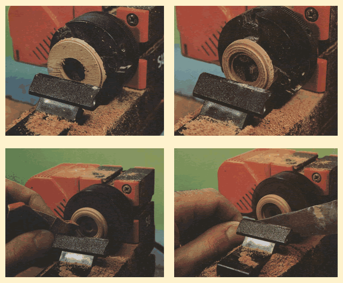 para realizar las volutas que rematan la regala hemos utilizado un cilindro de madera del mismo ancho y grueso que el trozo de amura sobrante.La parte exterior del cilindro ha sido tallado en dos círculos concéntricos, uno más profundo que el otro. El aro más saliente se ha cortado por uno de sus lados para que se adapte a la tapa de regala. La parte superior debe adaptarse lo más posible para que al lijar e igualar, apenas se note la unión. Por último la tapa de regala de la zona del combés se ha prolongado mediante un listón de la misma madera, por toda la borda, tanto en el castillo como en el alcázar, justo encima.