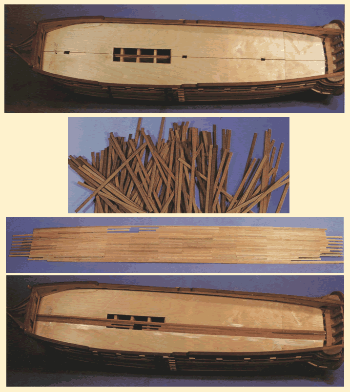 Se pegará y clavará una traca siguiendo toda la línea de cubierta en ambos costados del casco, que nos servirá como maestra y marcará la dirección de las restantes.