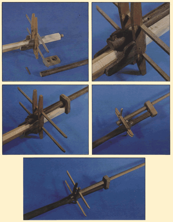 Tomando la medida con el compás de las piezas que forman el mecanismo de entrada de maniobra de las vergas, se construirán con maderas del mismo tono o más oscuras que el resto del forro. Se buscarán piezas redondas y aplanadas para hacer las poleas. En el mercado las hay de diferentes medidas. También pueden tornearse o sustituirlas por vigotas. Se clavarán unos alfileres en uno de los lados, que pasarán a través de las poleas, y se cortará y limitará el sobrante del alfiler. Realizadas las aberturas correspondientes, se encajarán las piezas y se pegarán dejándolas preparadas para el momento del lijado e igualado final.