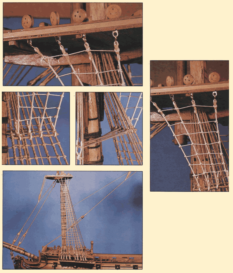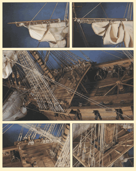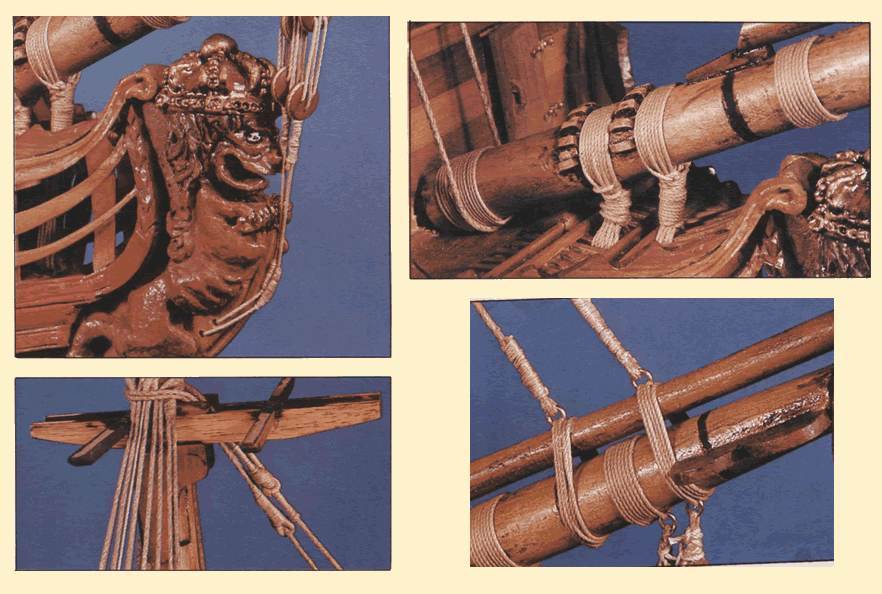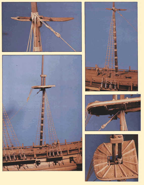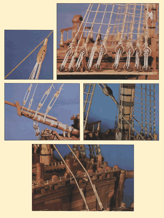 Es importante que tanto las vergas como los mástiles sean debidamente provistos de sus motonaduras y cuadernales, así como otros accesorios. Primero se instalarán los cuadernales y amarres que sirven para la sujeción y movilidad de las vergas. En este caso se han realizado mediante un cabo grueso, al que se ha enrollado otro muy fino (gaza), un hilo de coser de color. Después se han colocado todos los motones siguiendo el plano. En el caso que el modelista dispusiera de otra documentación y quisiera reflejarla, deberá dibujar- la sobre el plano lo más precisamente posible para evitar errores, antes de fijarla en la obra. Otros elementos que deberán colocarse previamente son los botalones de ala y los marchapiés.