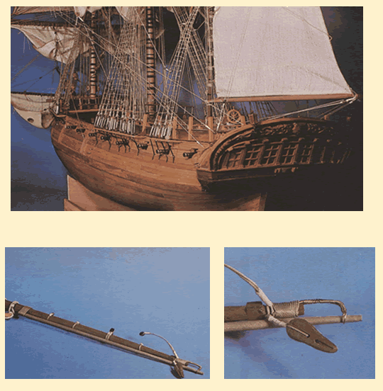 Aquí se aprecian los amantillos que sujetan la yerga al bauprés.