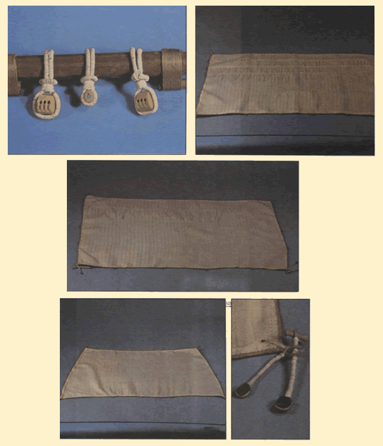 Para hacer las velas hemos utilizado una tela del tipo viscosa, aunque puede utilizarse otra más gruesa. Una vez confeccionadas, se han teñido con té. Todas llevan un dobladillo en todo su contorno y se han rebordeado con un cabo que en los vértices forma un bucle que son los puños. En estos mismos puños y, a intervalos, en los lados y parte baja de las velas, se han cosido con trozos del mismo cabo otros bucles que servirán para recoger la maniobra, necesaria para tensar las velas.