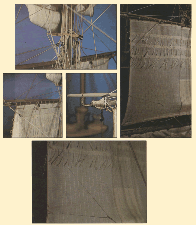 Algunas de ellas, concretamente la del bauprés, las del mástil y mastelero del trinquete, mástil y mastelero del mayor y cangreja llevan uno o más refuerzos horizontales, que son franjas de tela cosidas a la vela. De ellas parten unos cabos que sirven para aferrar las telas, los rizos. Como se verá más adelante, la vela del bauprés o cebadera lleva tres ojales redondos que servían para desalojar el agua embarcada en los cabeceos. Las velas se coserán a sus respectivas vergas antes de fijarlas en los palos, y en sus puños se pondrán los motones de que estén provistos.