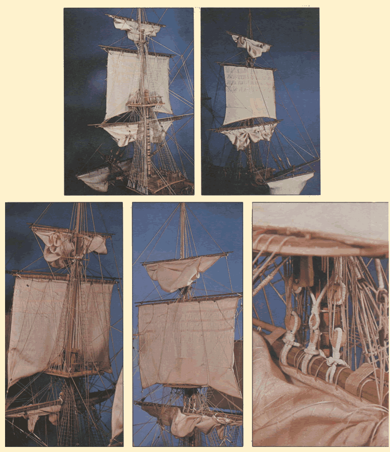 El palo trinquete y el bauprés con todo su aparejo terminado, visto por dos lados. La disposición de las velas, dentro de una colocación realista, se hará por motivaciones estéticas y de maniobra, corriendo a cargo del criterio propio de cada uno su situación, plegado, etc.