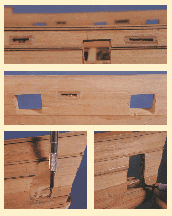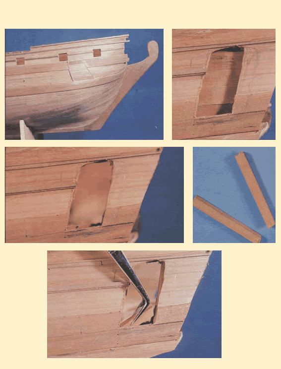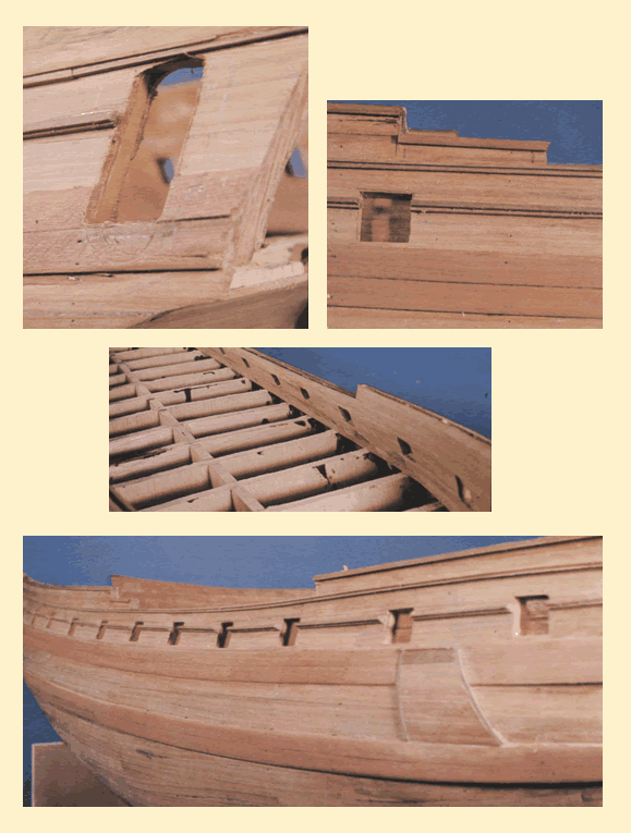 Lijar todo el conjunto e igualarlo.En el alcázar de popa se abren unas puertas que comunican la cámara del comandante y oficiales con el jardín donde se situaban las letrinas de la gente de popa. Primero se dibujarán con el lápiz por la parte exterior y se recortarán, para después pasar a la parte interna del forro.