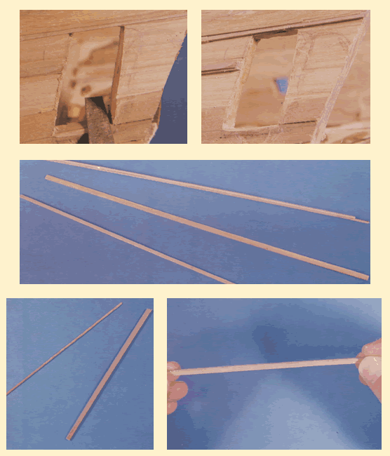 Las puertas deben quedar bien cuadradas, procurando que el marco tenga las menos irregularidades posibles, puesto que en su momento había de encajarse una puerta. Por ello la lima nos proporcionará un acabado liso Para la construcción de las escalas del casco utilizamos el mismo sistema que con las molduras: dos listones, uno más grueso que otro, que se pegarán.