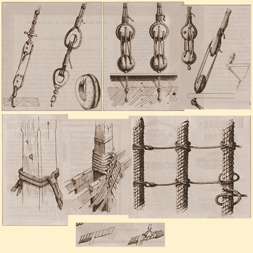 Los grandes cuadernales del estay del palo mayor. Mástil del trinquete con sus obenques, flechastes y estais. Unión de los obenques del mástil a las vigotas del mastelero, a través de la cofa por medio de la arraigadas. Los tensores del falso estay. Obenques y estais del mástil del mayor.