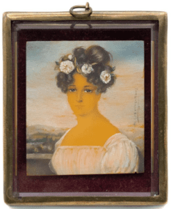 El «retrato de una dama» es un cuadro de pequeño tamaño, de 55 x 65 mm. Encontramos esta obra a la venta en internet. Lamentablemente y debido a una restauración deficiente y poco apropiada, ha sufrido daños significativos que afectaron su estado original. Aunque el estado actual de la obra no refleja el esplendor que tubo en su momento, sigue siendo un testimonio del talento de la artista, destacando su habilidad para capturar detalles con precisión y su delicadeza en el uso de la paleta de colores, lo que podemos ver en el cabello, pestañas y ojos, que son las únicas partes que se conservan del original.